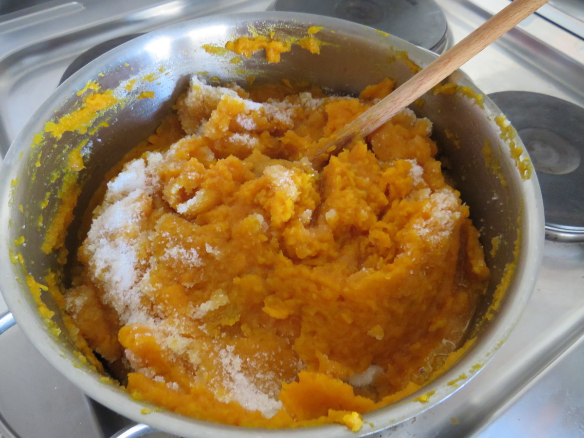 Koristite šerpu ili posudu koja ne zagoreva, a pasiranu masu sve vreme lagano mešajte. Dodajte i narendanu koricu limuna pa kuvajte sledećih pet minuta. Nakon toga ulijte sok od limuna i šećer pa nastavite da mešate. Sadržaj u šerpi će postati tečniji i potrebno ga je ukuvati.