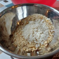 Pirinač se opere. Jednu trećinu oraha sameljite, ostatak isecite na krupnije komadiće. Ostavite nekoliko polovina jezgra.
