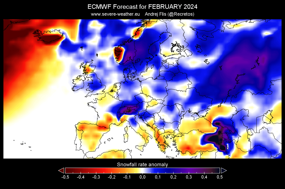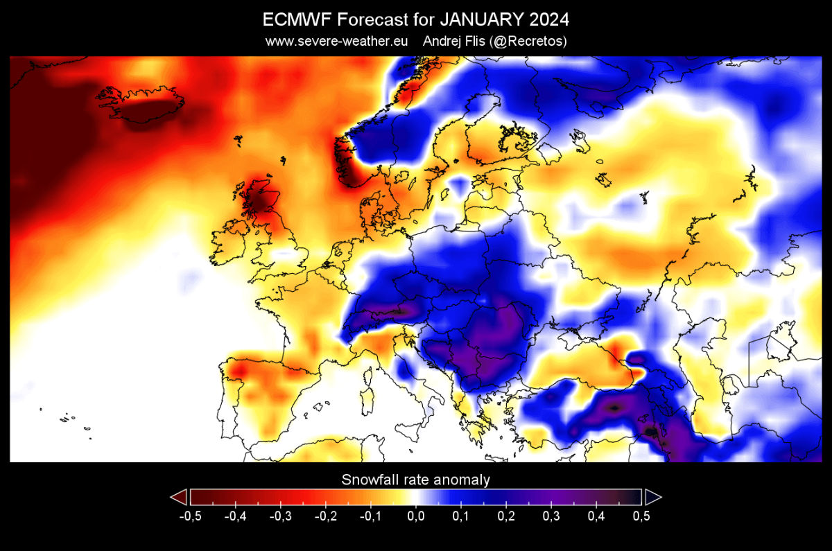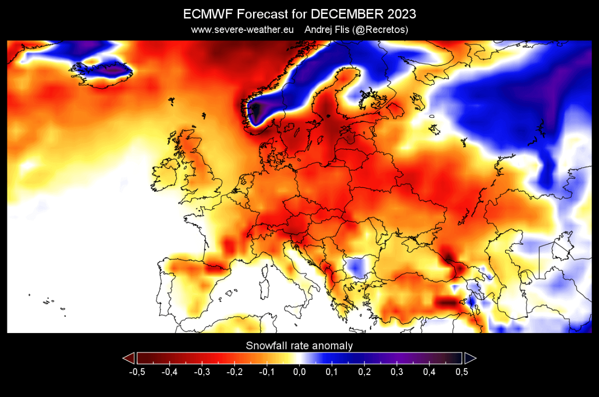 Prema ovom modelu se prognoziraju slabije snežne padavine u odnosu na prosek, osim za delove središnje Evrope i Skandinavije. U decembru ih predviđaju samo na krajnjem severu kontinenta.