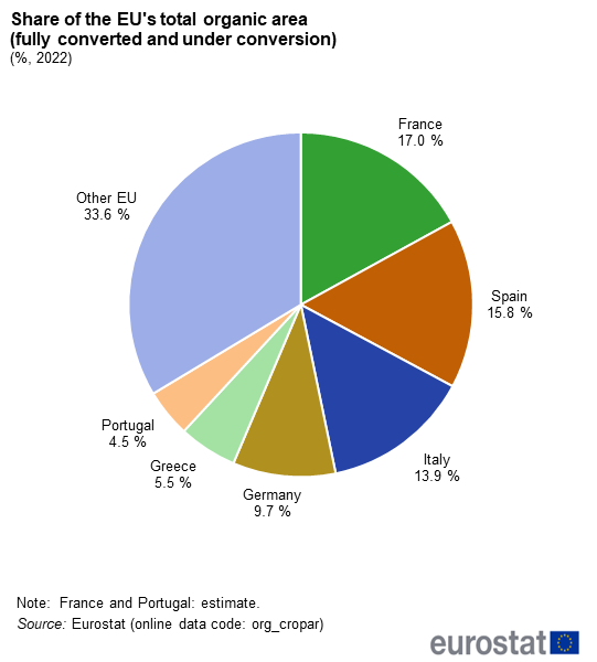 Kada je reč o količini zemljišta u eko proizvodnji, najviše ga ima Francuska, 2,9 mil. ha (17,0 odsto ukupne EU površine). Francuska, zajedno sa Španijom (2,7 mil. ha), Italijom (2,3 mil. ha) i Nemačkom (1,6 mil. ha) čine većinu (56 odsto) ukupnih eko površina EU-a 2022.