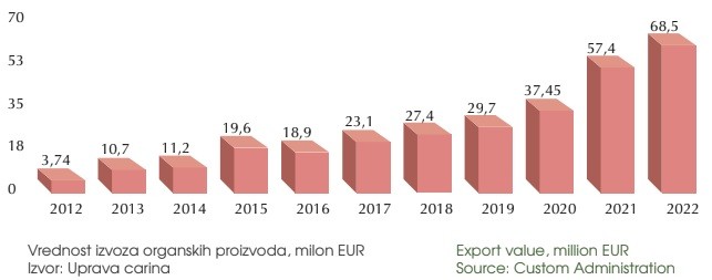 Vrednost izvoza organskih proizvoda već godinama beleži konstantan rast, pa je i u 2022. godini porastao u odnosu na prethodnu, i ujedno je to rekordan iznos od 2012. godine kada su prvi put ovi podaci postali deo informacionog sistema Uprave carina, pa je od tada zabeležio porast od oko 18 puta, podaco su Serbia Organica-e.