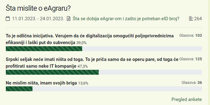 U Agroklub anketi na pitanje "Šta mislite o eAgraru?", 47,3 odsto glasača je nepoverljivo, 39 odsto ima pozitivno mišljenje o ovoj promeni, dok ostatak nema nikakvo.