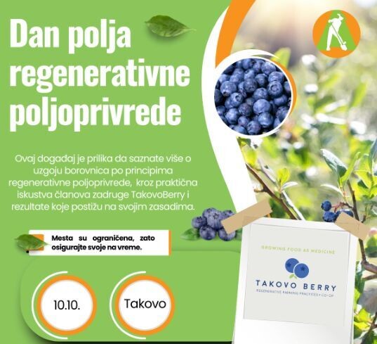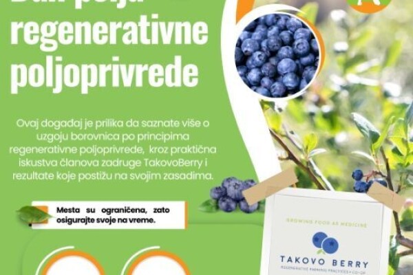 U petak, 10. oktobra, na imanju zadruge Takovo berry biće održan Dan polja regenerativne poljoprivrede, posvećen primeni ovih principa u voćarstvu kroz uzgoj američke borovnice. Domaćin Mileta Čuljković predstaviće iskustva zadruge – od načina gajenja i korišćene mehanizacije do analiza koje unapređuju plodnost zemljišta i doprinose zdravim zasadima. Kako najavljuju iz Saveza za regenerativnu poljoprivredu Srbije, okupljeni će imati priliku da kroz praktične demonstracije i predavanja saznaju više o prednostima regenerativnog pristupa u voćarstvu. Učešće je besplatno, ali broj mesta je ograničen na 40. Registracija traje do 3. oktobra u 17 časova ili do popunjavanja kapaciteta. #danpoljaregenerativnepoljoprivrede