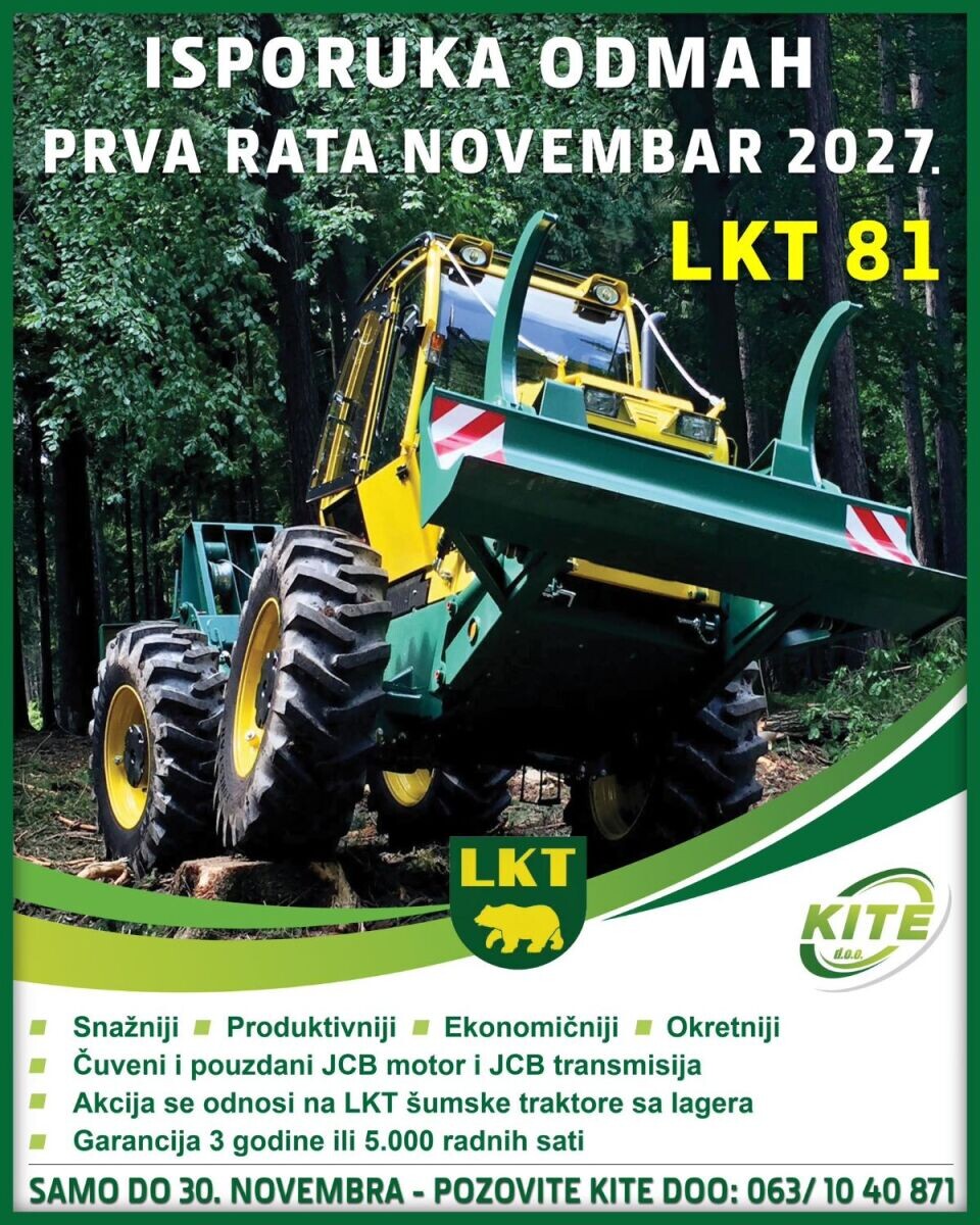 Olakšajte sebi posao u šumi uz okretne i snažne LKT zglobne traktorei specijalni model financiranja - isporuka ogmah - prva rata novembar 2027. LKT 81 – NAJPOPULARNIJI ŠUMSKI TRAKTORI U SRBIJI ✅Snažni ; Produktivni ; Ekonomični ; Okretni... Više [+]