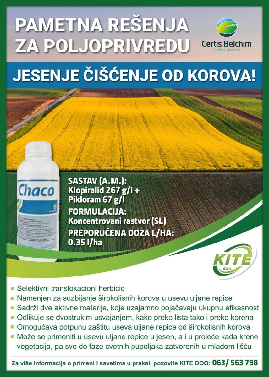 CHACO - Jesenje čišćenje repice od korova! PAMETNA REŠENJA ZA POLJOPRIVREDU ! Doza: 0,35 l/ha Primena: jesen – do zatvaranja pupoljaka u proleće Dve aktivne materije = maksimalna efikasnost! ✔ Selektivni translokacioni herbicid za uljanu re... Više [+]