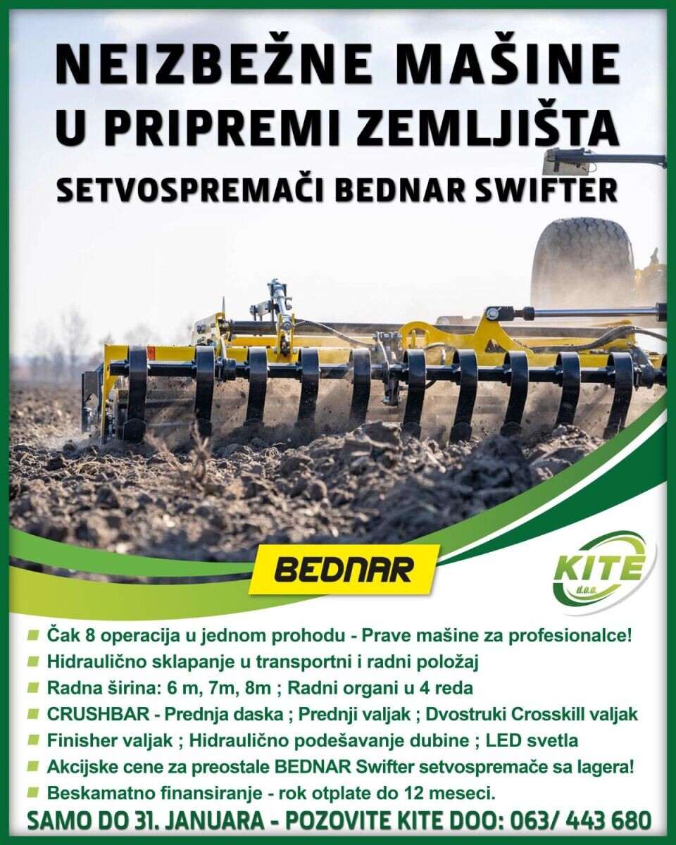 Za detaljne informacije u vezi sa svim modelima setvospremača BEDNAR SWIFTER i AKCIJSKIM CENAMA DO 31. JANUARA 2026. - Pozovite kompaniju KITE DOO Novi Sad: