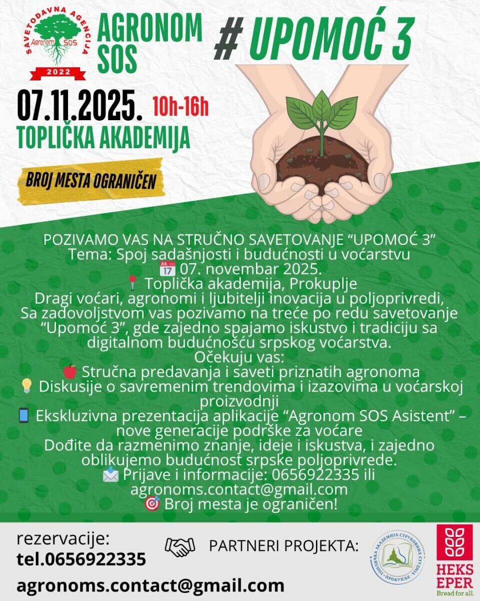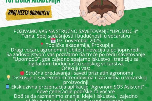 Savetodavna agencija Agronom SOS organizuje u petak, 7. novembra, na Topličkoj akademiji u Prokuplju, stručno savetovanje pod nazivom Upomoć 3, posvećeno temi Spoj sadašnjosti i budućnosti u voćarstvu. Cilj ovog okupljanja je da agronomima, voćarima i svima zainteresovanim za savremenu poljoprivredu ponudi priliku da čuju savete priznatih stručnjaka, razmene iskustva i upoznaju se sa najnovijim trendovima i tehnologijama u voćarskoj proizvodnji. Poseban akcenat biće na predstavljanju aplikacije Agronom SOS asistent, inovativnog digitalnog alata namenjenog voćarima, dok će u pauzi između panela učesnici imati priliku da prisustvuju degustaciji i ocenjivanju rakija. #agronomsos #vocarstvo