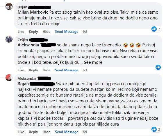 Na tu prepisku se nadovezao Bojan: "Svako bi uneo kapital u taj posao da ima, jer je najlakši. Vi nemate potrebu da budete svaštari ko mi recimo koji nemamo kapacitet zemlje da budemo ratari. Ja da mogu da dođem do više zemlje odma bih bacio sve i bavio se samo ratarstvom. Vama svaka čast, znam da imate moćne i dobre mašine i znam da vrede puno, da da bog, da za koju godinu imate duplo bolje i moćnije, ali ako imate toliki rizik unošenja kapitala vi budite stočari i povrtari pa ćeš da vidiš kad ti ugine, ne daj bože, bik - dva, tri pa u jednom danu izgubiš par hiljada evra."