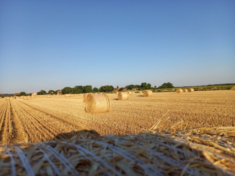 Na širokom žitnom polju pod vedrim nebom, sunce obasjava balirane bale slame, ostavljajući za sobom tišinu rada i plodove letnje žetve. U daljini selo spava među stablima, dok priroda odmara nakon ciklusa života #RuralFoto #priroda
