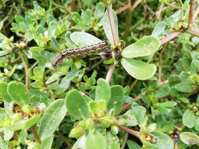 Pamukova sovica (Helicoverpa armigera) je izuzetno polifagna vrsta koja se hrani na oko 250 različitih vrsta biljaka. Kod nas je poznata je kao velika štetočina kukuruza i paprike, a u odsustvu domaćina razvija se i na korovskim vrstama, koje joj omogućavaju da zaokruži životni ciklus. Na slikama su prikazane larve treće generacije koje se hrane na korovskoj biljci Portulaca oleracea - Tušt.