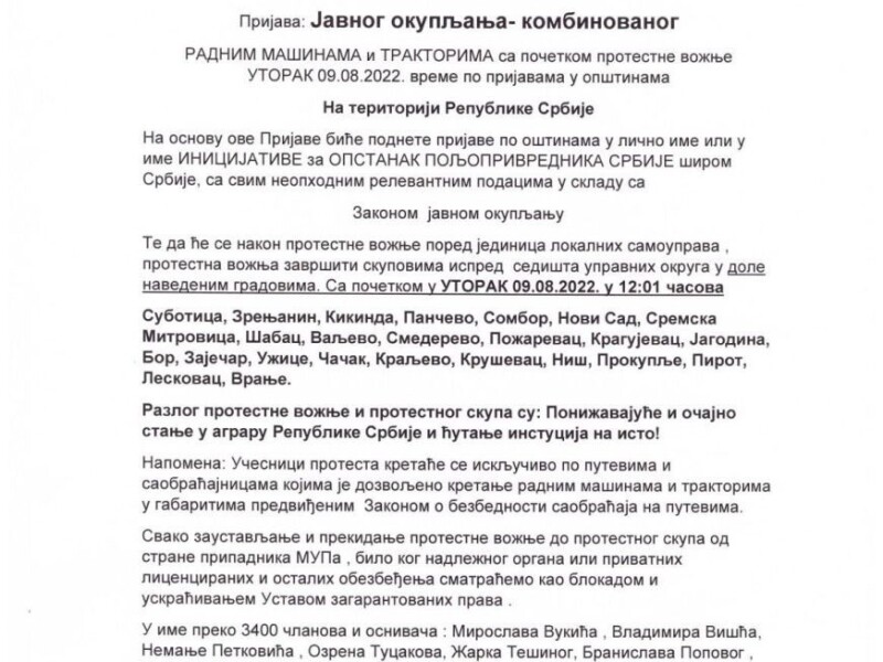 Prijavljen protest - javno okupljanje radnim mašinama i traktorima sa početkom protestne vožnje u utorak 9.8. u 12:01 časova.