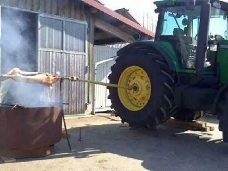 Kako možete prase okretati na ražnju? Jednostavno! Posle postavljanja praseta na ražanj, spojite ga na zadnju osovinu traktora. Pošto dizelovi motori mogu da imaju minimalan broj obrtaja i 540 o/min, spojite na redukciju u odnosu 1:4 i lagano okrećete prase bez problema.