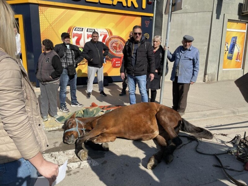 Kobila koja je vukla teret pala je od umora na raskrsnici Takovske, Nemanjine i Ulice Bratstva i jedinstva u Požarevcu.
