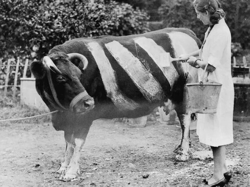 Fotografija iz Drugog svetskog rata, na kojoj farmerka farba svoju kravu, da bi bila uočljivija po mraku, ukoliko izađe na put.