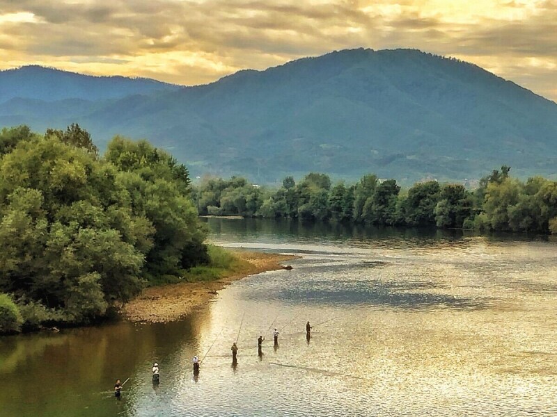 Pecarosi se trude oko ulova ribe pri zalasku sunca na reci Drini. #RuralFoto #priroda