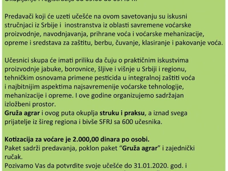 Pozivamo Vas na IX savetovanje voćara "Gruža 2020"