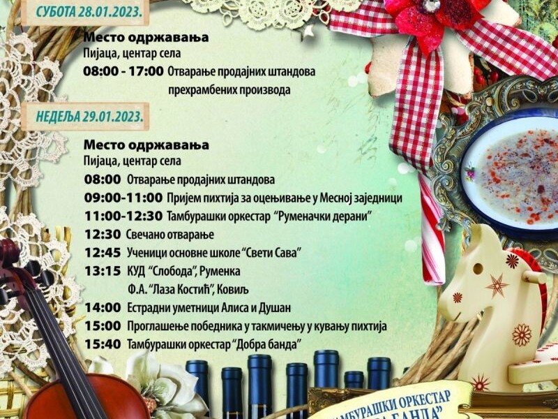 Jubilarna, 20. Rumenačka pihtijada biće održana u nedelju, 29. januara, na pijaci u centru Rumenke, gde posetioce očekuju razni gurmanski specijaliteti, ocenjivanje pihtija i bogati kulturno-umetnički sadržaji. Ovo je najveća pihtijada u Srbiji. Tokom manifestacije, biće priređen bogat kulturno-umetnički program, slikarska kolonija, kao i štandovi sa pihtijama i drugim mesnim specijalitetima karakterističnim za Vojvodinu. Svi oni koji vole da kuvaju pihtije, svoje kulinarske sposobnosti moći će da provere na takmičenju u okviru Rumenačke pihtijade. U mesnoj zajednici u Rumenki zainteresovani će moći da donesu svoje pihtije na ocenjivanje u nedelju, 29. januara od 9 do 11 časova. #pihtijada