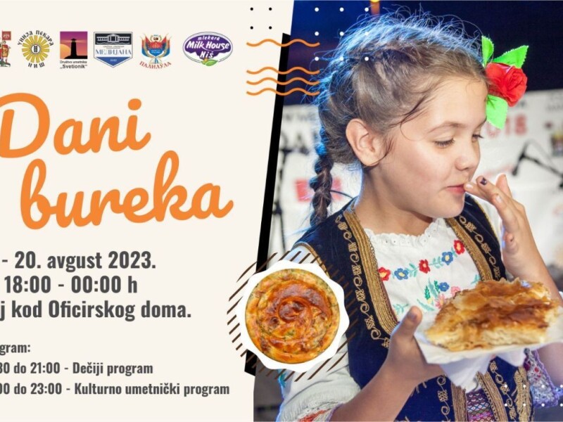 U Nišu će jubilarni 20. put biti održani "Dani bureka" od 17. do 20. avgusta na keju kod Oficirskog doma, a organizatori najavljuju da će posetioci prvi put moći da okuse "moravski burek", koji je spoj tradiconalne južnjačke salate i niškog specijaliteta. Predsednik "Unije pekara" i organizator manifestacije "Dani bureka" Bata Vukadinović najavljuje učešće oko 10 pekara iz Niša, kao i goste iz Kruševca i Bugarske, a osim novih ukusa i nadeva, poput bureka sa duvan čvarcima, sa zdenkom i suvim vratom i kulenom, kaže da će biti i slatkih sa kremom i bananom. Očekuje oko 20.000 posetilaca tokom četiri dana koliko Buregdžijada traje, a biće otvorena za posetioce od 18 sati do ponoći. #danibureka