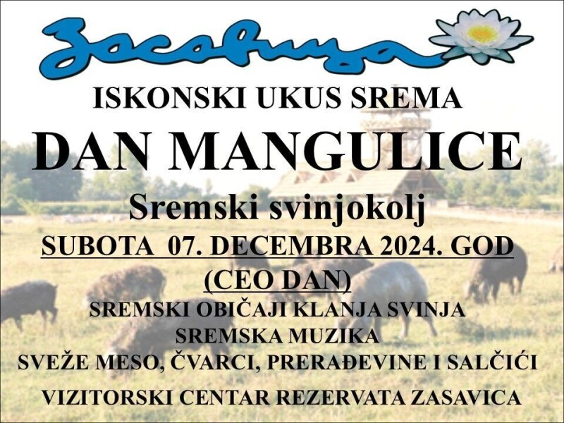 U organizaciji Specijalnog rezervata prirode Zasavica u subotu, 7. decembra biće održana tradicionalna manifestacija Dan mangulice – sremski svinjokolj. Svi oni koji u subotu budu deo ove manifestacije upoznaće se sa sremskim običajima klanja svinja, moći će da degustiraju proizvoda od mangulice, kao i da kupe sveže meso, čvarke i prerađevine i probaju nezaobilazne kolačiće – salčiće. I sve to uz muziku, rakiju i probrana vina… Inače, Rezervat je jedan od vodećih odgajivača u Srbiji te autohtone rase svinja čije je meso, zbog posebnih svojstava, sve traženije u Srbiji i u svetu. Osim svežeg mesa na Dan mangulice, u rezervatu su u ponudi suhomesnati proizvodi od mangulice tokom cele godine. #danmangulice
