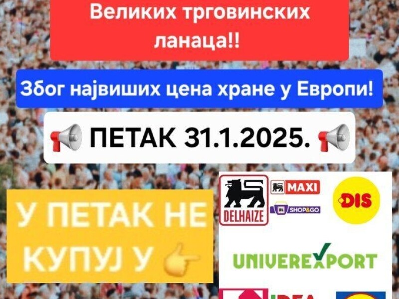 Udruženje za zaštitu potrošača Efektiva pozvalo je juče građane Srbije na bojkot velikih trgovinskih lanaca u petak, 31. januara. Efektiva je podsetila da su potrošači u Hrvatskoj bojkotovali trgovinske lance i time smanjili prihod tih lanaca za čak 47 odsto. ”Vreme je da potrošači uzvrate udarac“, naglasili su u pozivu. Predsednik Efektive Dejan Gavrilović kaže da je teško dati prognozu efekata bojkota trgovinskih lanaca koji bi u Srbiji prvi put bio organizovan. Kako je dodao, pitanje je koliko će ljudi to da uradi, jer je društvo polarizovano ali da bi trebalo da reaguju i da se bar taj jedan dan usaglase sa ovim pozivom, kako bi naterali trgovce da modifikuju svoju cenovnu politiku. #bojkotprodavnica
