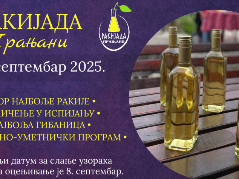 Pranjani će 20. septembra ponovo biti prestonica dobre kapljice – održava se 23. Rakijada, manifestacija koja okuplja najbolje proizvođače, ljubitelje rakije i sve one željne druženja i zabave. Kao i svake godine, posetioce očekuje raznovrstan program: izbor najbolje rakije, ekipno takmičenje u ispijanju, nadmetanje u pripremi gibanice, uz bogat kulturno-umetnički i zabavni sadržaj. Proizvođači mogu poslati uzorke rakije do 8. septembra na adresu organizatora. Rakije će se ocenjivati u više kategorija – od šljive i loze do dunje, kajsije, jabuke i likera. Rakijada ne bi bila potpuna bez takmičenja u pripremi gibanice, koje tradicionalno okuplja domaćice i ljubitelje ovog specijaliteta. #rakijadapranjani