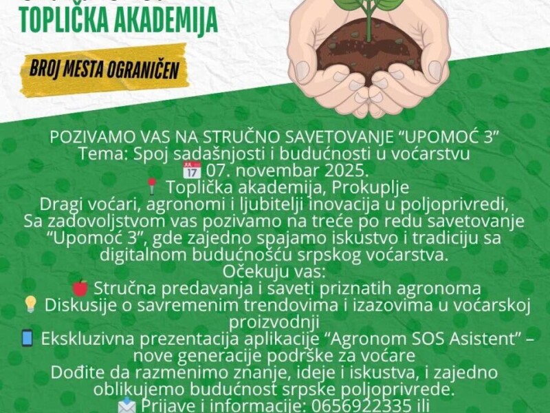 Savetodavna agencija Agronom SOS organizuje u petak, 7. novembra, na Topličkoj akademiji u Prokuplju, stručno savetovanje pod nazivom Upomoć 3, posvećeno temi Spoj sadašnjosti i budućnosti u voćarstvu. Cilj ovog okupljanja je da agronomima, voćarima i svima zainteresovanim za savremenu poljoprivredu ponudi priliku da čuju savete priznatih stručnjaka, razmene iskustva i upoznaju se sa najnovijim trendovima i tehnologijama u voćarskoj proizvodnji. Poseban akcenat biće na predstavljanju aplikacije Agronom SOS asistent, inovativnog digitalnog alata namenjenog voćarima, dok će u pauzi između panela učesnici imati priliku da prisustvuju degustaciji i ocenjivanju rakija. #agronomsos #vocarstvo