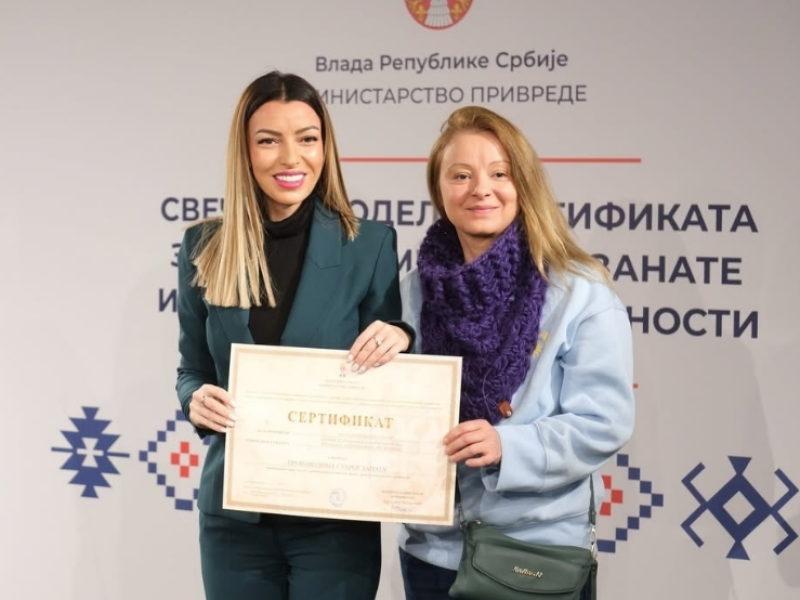 Ministarka privrede Adrijana Mesarović uručila je juče, u Etnografskom muzeju, 32 sertifikata za stare i umetničke zanate i najavila da će u narednom mesecu biti raspisan program podrške kroz bespovratna sredstva za sve koji se bave domaćom radinošću. Ona je istakla da narodi koji ozbiljno čuvaju identitet sistemski štite narodnu umetnost, a da starim zanatima pripada posebno mesto u kulturnom nasleđu. Prema njenim rečima, ti predmeti nisu masovna roba, već ”nosioci pamćenja, iskustva i kontinuiteta“. Dodala je da sertifikati nemaju novčanu vrednost, ali su zvanično priznanje države – savremeno ”majstorsko pismo“ i podstrek zanatlijama da razvijaju i predstavljaju tradiciju Srbije. #starizanati