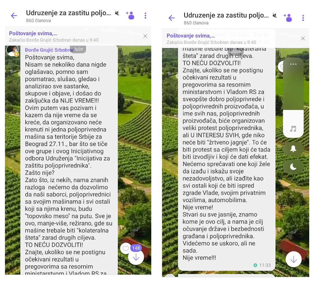 Viber grupa "Udruženje za zaštitu poljoprivrednika" donela je odluku da ne učestvuje na protestima planiranim za danas (27.11.) u 14h ispred Vlade Srbije u Beogradu.