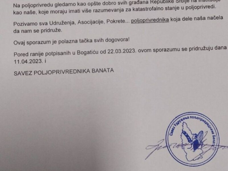 Udruženju poljoprivrednika Srbije sporazumom koji je nedavno sklopljen u Bogatiću između nekoliko udruženja i asocijacija proizvođača se pridružio i Savez poljoprivrednika Banata.