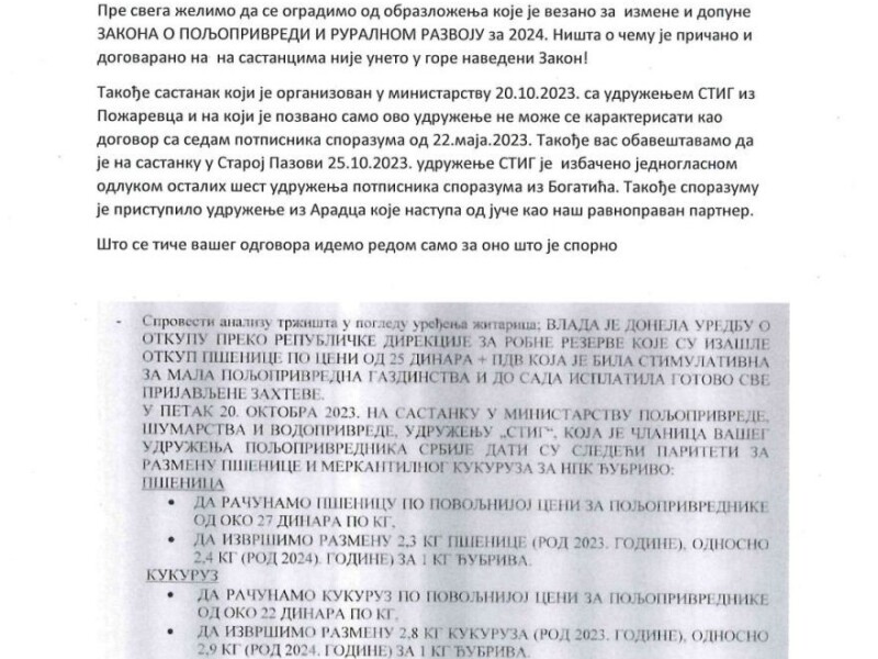 Ujedinjena udruženja poljoprivrednika koja su pregovarala sa Ministarstvom poljoprivrede oko ispunjavanja njihovih zahteva su poslala dopis u vezi sa do sada urađenim i koji su njihovi zahtevi za 2024. godinu