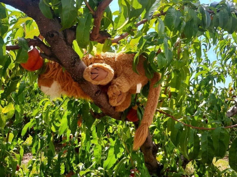 Ova fotografija je nastala u jednom voćnjaku u selu Gornja Trnava gde je uveliko berba nektarina. Dok sam prilazila stablu mislila sam da je mačka na grani, ali kad sam prišla bliže videla sam da je dečja igračka koja je tokom berbe i posete voćnjaku završila u granama i tu ostala. Sada vlasnici šaljivo kažu da ovaj plišani lavić čuva voćnjak i nadgleda berbu.