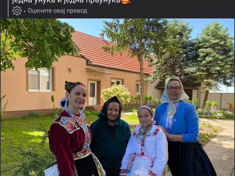 Čuvanje naše seoske nošnje i tradicije na Nedeljnoj misi.Obučene smo svaka u nošnju po godinama,najstariju nošnju nosi baka u zelenom puloveru ili dzemperu,najmladja curica sa slike ima vec malo savremeniju i bogatiju nošnju.