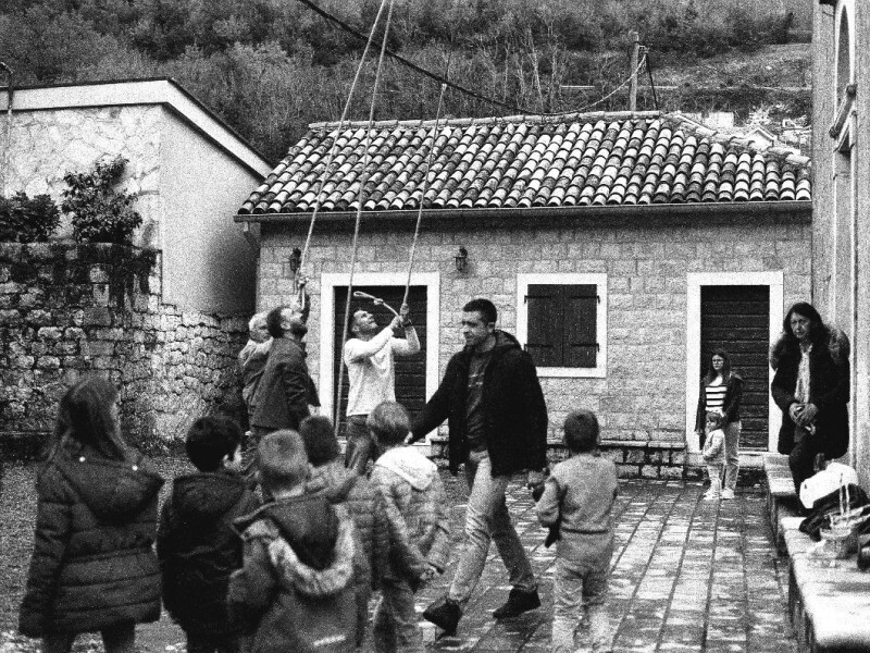 Stanovnici malenog ali predivnog i energičnog Gornjeg Morinja okupili su se ispred crkve u nedelju ujutru. Svako malo kada se treba oglasiti zvono, stanovnici pritrčavaju kanapima pri zvoniku da bi ga pokrenuli. Ispred njih su deca u jeku radoznalosti, posmatraju starije i kasnije se kucaju jajima (korpe na zidicu desno).