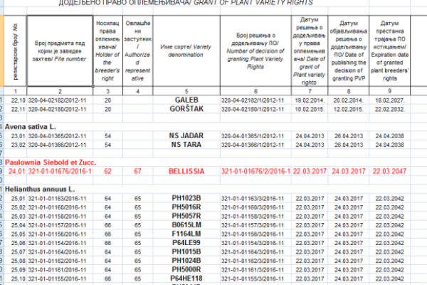 Prva i jedina registracija paulovnije u Registru zaštićenih biljnih sorti Ministarstva poljoprivrede Srbije je Paulownia Bellisima. Rešenjem, zavednim pod rednim brojem 321-01-01676/2/2016-11, Ministarstvo je dalo autoritativnu potvrdu da je hibrid Bellissima kvalitetan i bezbedan za sadnju...