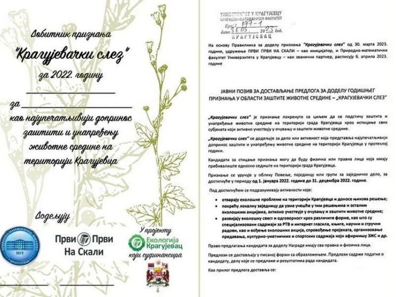 Удружење ПРВИ ПРВИ НА СКАЛИ – као иницијатор, и Природно-математички факултет (ПМФ) Универзитета у Крагујевцу – као званични партнер, расписали су Јавни позив за достављање предлога за доделу годишњег признања у области заштите животне средине "Крагујевачки слез".