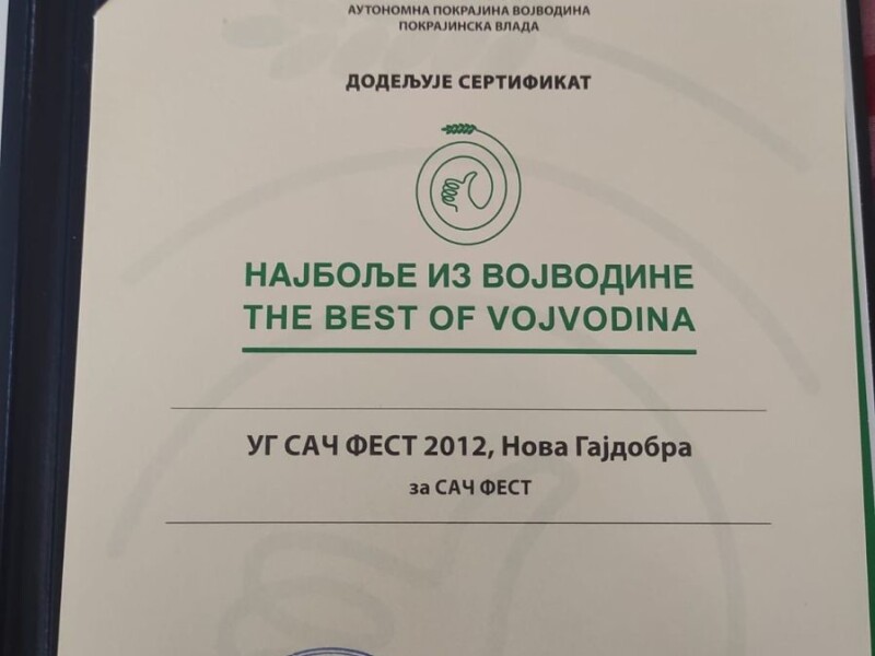 Sertifikat "NAJBOLJE IZ VOJVODINE" danas je u zgradi vlade AP Vojvodine dodeljen UG.SAČ FEST - Nova Gajdobra.