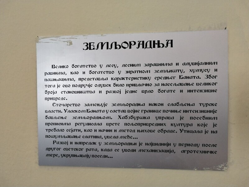 Odeljak Narodnog Muzeja u Zrenjaninu posvećen zemljoradnji i stočarstvu na području srednjeg Banata. U njemu se mogu videti fotografije kako se nekada živelo na tom prostoru i upoznati sa oruđima koja su tada korišćena za obradu zemljišta.