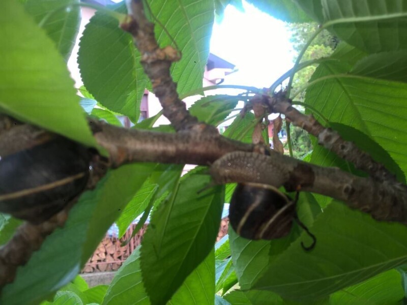 Puževi na trešnji... I oni pobegli od vlage u zemlji i travi... :-(