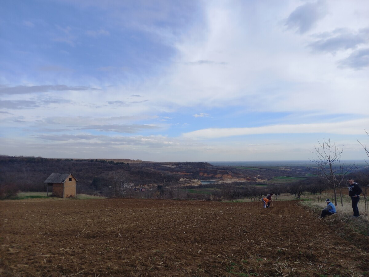 Kada sam počela da se spuštam niz asfaltni put, srela sam grupu vrednih Sremaca koji su sadili luk.