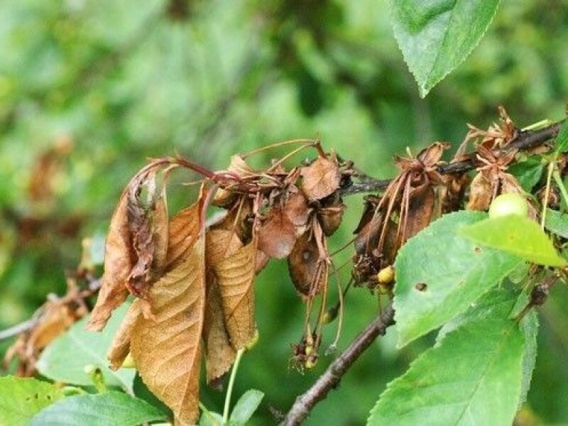 I) Još u završetku cvetanja mnogi mladari zajedno sa cvetom suvi, kao da ih je uništio mraz. Plodovi posmeđe, meso protrune i na površini ploda javljaju se sivi jastučići. Neki plodovi otpadnu, drugi, suvi, ostanu preko zime na stablu ("mumije").