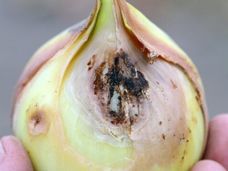 I) Larve se ubušuju i razvijaju u središnjem delu mladih biljaka ili u lukovici. Na mladim biljkama larve su smeštene pri osnovi srednjeg lišća - koje usled oštećenja vene i pri povlačenju prekida, a biljke se suše i propadaju. Na odraslim biljkama larve se nalaze u glavici, što dovodi do truljenja.