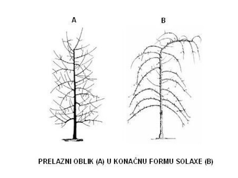 Kod solakse je stablo visoko 2,1 - 2,3 m, a na provodnici imamo spiralno raspoređene duge rodne grane debljine maksimalno jedne trećine provodnice koje se ukrive pod težinom plodova. Na tim granama imamo kratko rodno drvo, na kome se formiraju mešoviti pupoljci. Vrh stabla je ukrivljen pod teretom roda.