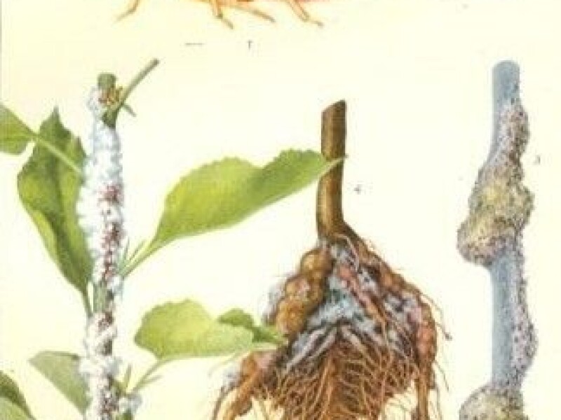 Krvava vaš na jabuci: beskrilna ženka, vaši pokrivene beličastom voštanom prevlakom, napad na korenu, letorastu i tumoraste izrasline na grani i korenovom sistemu jabuke;