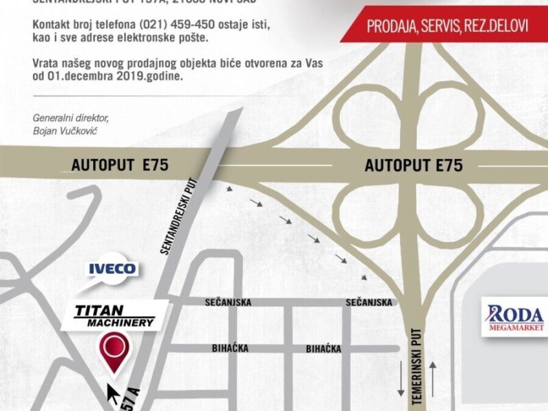 Sa velikim zadovoljstvom Vas obaveštavamo da se poslovna jedinica kompanije Titan Machinery doo, premešta na novu, prostraniju i pristupačniju lokaciju čiji prostor u potpunost odgovara zahtevima modernog poslovanja, servisa poljoprivrednih mašina i magacina rezervnih delova.