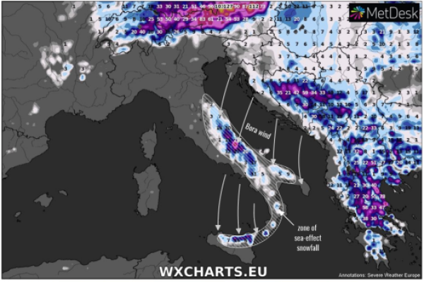 Significant sea-effect snow is expected across parts of central and southern Italy over the next 3-4 days, as the Arctic outbreak pushes cold Bora / Gregale winds over the relatively warm Adriatic and...