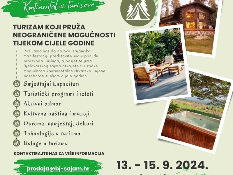 31.Jesenski međunarodni bjelovarski sajam bit će po mnogočemu uistinu poseban, a jedan od noviteta je KON-TUR manifestacija koja će predstaviti sve traženiji i popularniji kontinentalni turizam. Izlagači će moći predstaviti svoju ponudu proizvoda i usluga, a posjetitelji Bjelovarskog sajma otkrit će mogućnosti kontinentalne Hrvatske i njene posebnosti tijekom cijele godine. Predstavit će se smještajni kapaciteti, turistički programi i izleti, aktivan odmor, kulturna baština i muzeji, oprema, namještaj, dekori te tehnologije i usluge u turizmu 👇
