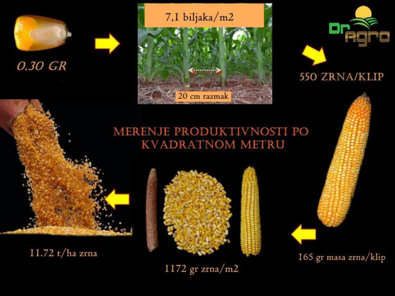 Tih 7.1 biljaka po m2 sa prosečnim klipovima od 165 grama/biljka daće prinos po m2 od 1172 grama, odnosno 11,72t/ha.
