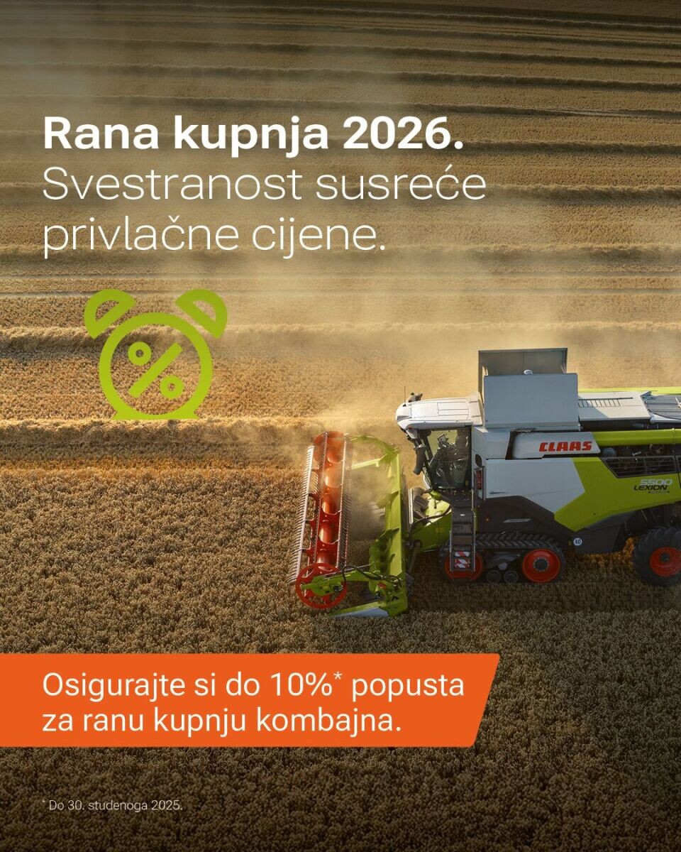 CLAAS rana kupnja u 2026. CLAAS ponovno nudi atraktivne popuste za ranu kupnju i nove pakete za svoje kombajne koji će vam znatno olakšati radni dan. Posebne ponude dostupne su i za nove modele LEXION i TRION, kao i za balirke ROLLANT 630 i... Više [+]