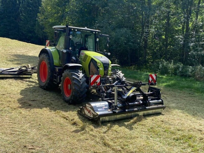 Jedna zanimljiva kombinacija Claas Arion 550 uparen sa prednjim malčerom Muthing MU-VARIO SHARK 2.0 i zadnjim bočnim Muthing MU L/S 220