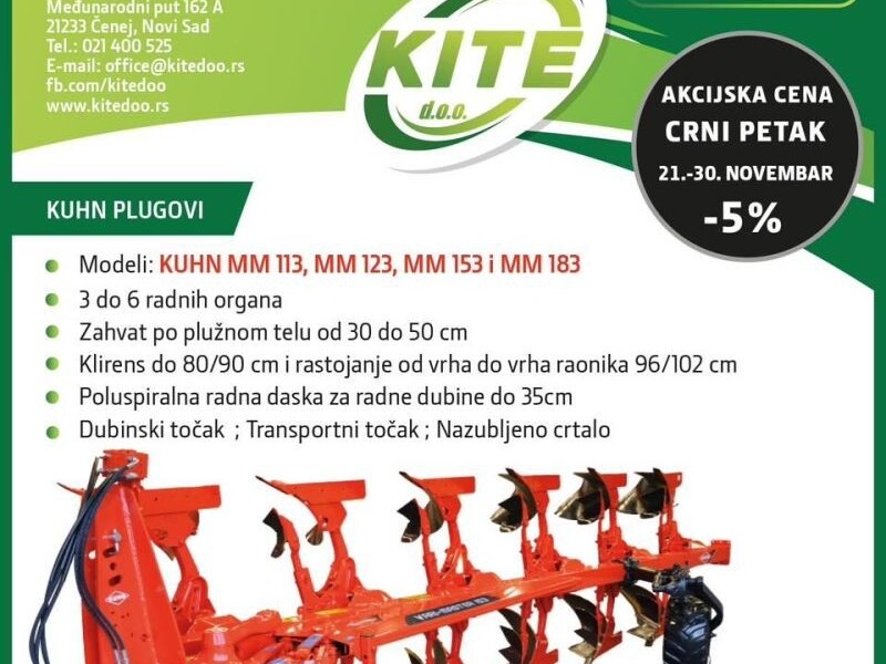Iskoristite ovako retku priliku na vreme i zgrabite 5% popusta na odabrane modele KUHN plugova - pozovite kompaniju KITE DOO na neki od brojeva telefona: